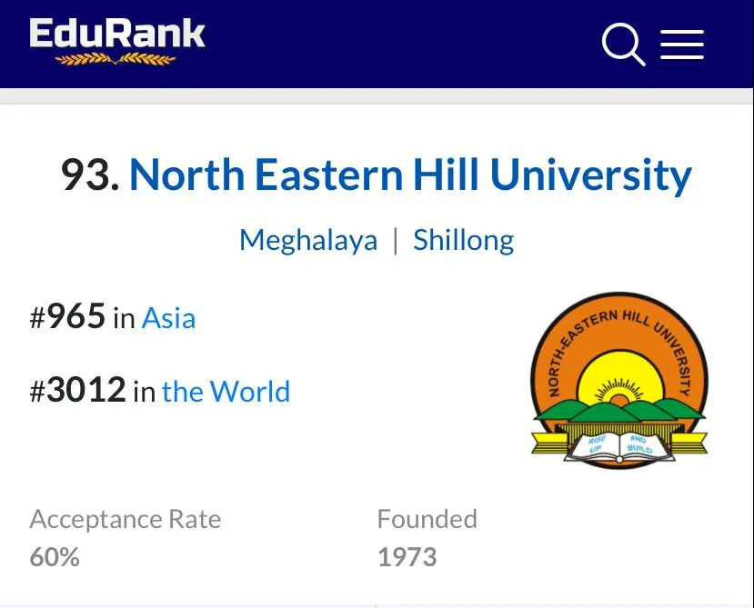 Shillong, April 8: EduRank – an independent, metric-based ranking of universities worldwide, has placed North Eastern Hill University (NEHU), Shillong, in the 93rd spot among the top 100 universities in India.